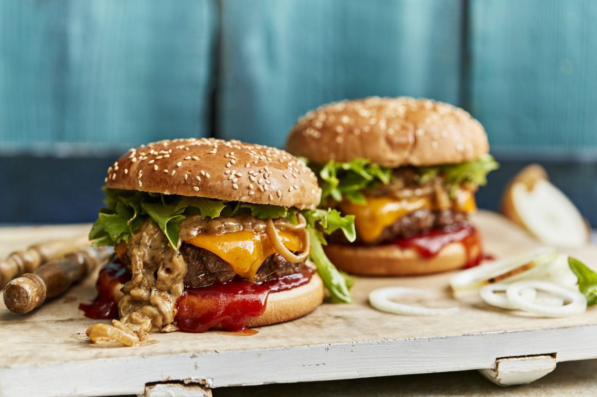 Mehevät hampurilaiset saavat vaihtelua karamellisoidusta sipulikastikkeesta. Knorr Fond ”du Chef” -annosfondi maustaa pihvit ja kastikkeen meheviksi.