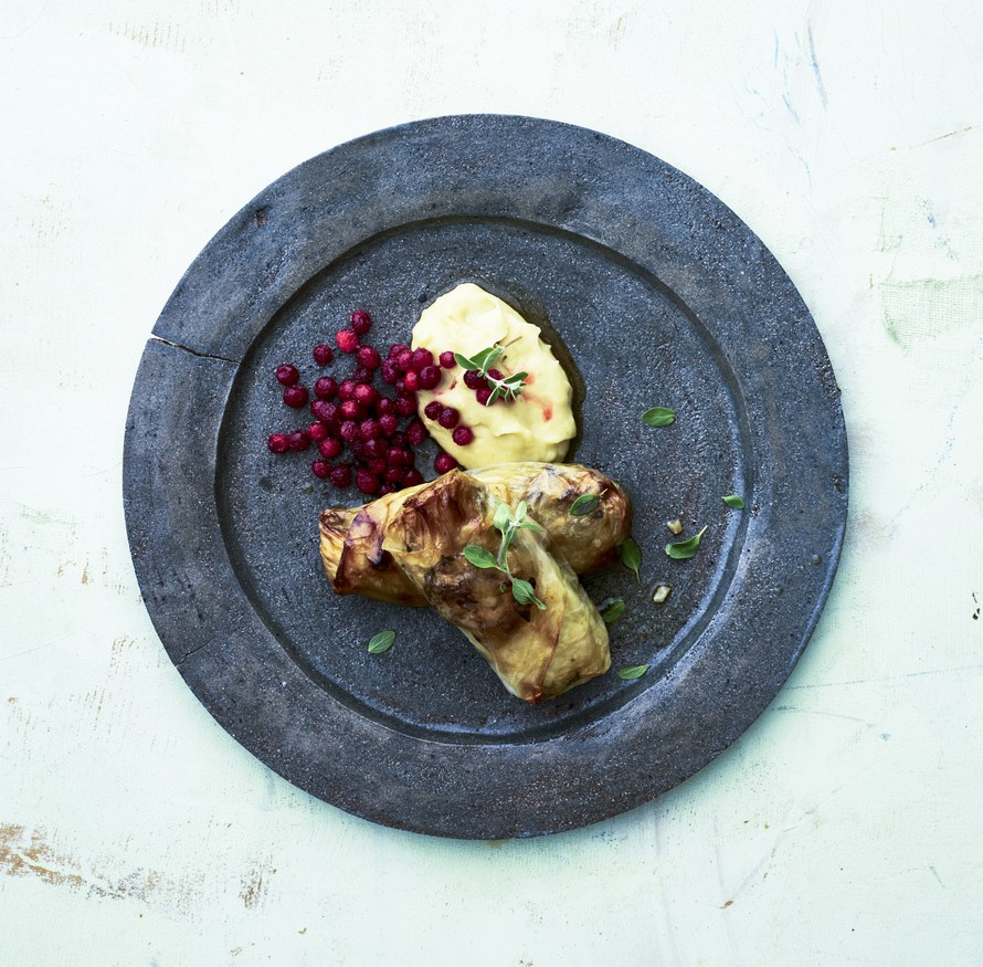 - Valele kääryleet voisulalla ja siirapilla. Hauduta uunissa 2 tuntia. Valele puolen tunnin välein kääryleistä irtoavalla nesteellä. Nosta lopuksi uunin lämpötila 250 asteeseen. Kypsennä 10–15 minuuttia, jotta kääryleet ruskistuvat.
