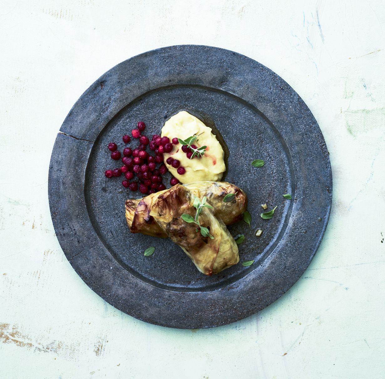- Laita uuni kuumenemaan 120 asteeseen. Aseta kaalinlehti työalustalle, leikkaa paksu lehtiruoti pois tai ohenna se veitsellä. Lusikoi lehdelle vajaa 1 dl täytettä, nosta reunat täytteen päälle ja kääri lehti rullaksi. Laita kääryleet uunivuokaan tiiviisti toisiaan vasten. Sulata voi.