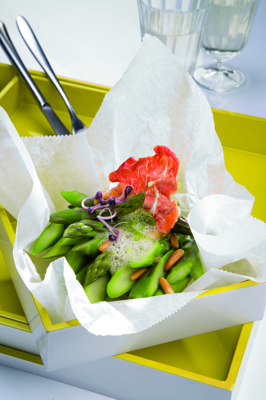 Aseta nyytit lautaselle ja avaa paperi. Hienonna tuoreet yritit ja ripottele parsan päälle pinjansiemenien kanssa. Ravista viinietikkakastiketta jälleen kunnes se vaahtoaa ja pirskota parsan päälle. Nosta pala parmankinkkua jokaisen annoksen päälle ja tarjoile ateria suoraan nyyteistä.