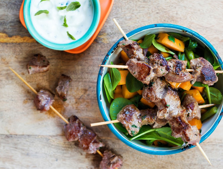 - Paista tai grillaa lihavartaita 1–2 minuuttia puoleltaan tai haluamaasi kypsyyteen. Mausta suolalla ja pippurilla. Tarjoa vartaat salaatin ja jogurttikastikkeen kanssa.