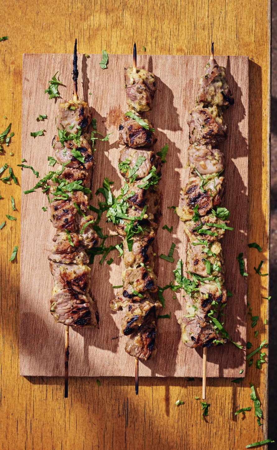 - Tikuta lihat varrastikkuihin ja grillaa kuumassa grillissä 3 minuuttia per puoli. Mausta suolalla ja pippurilla.