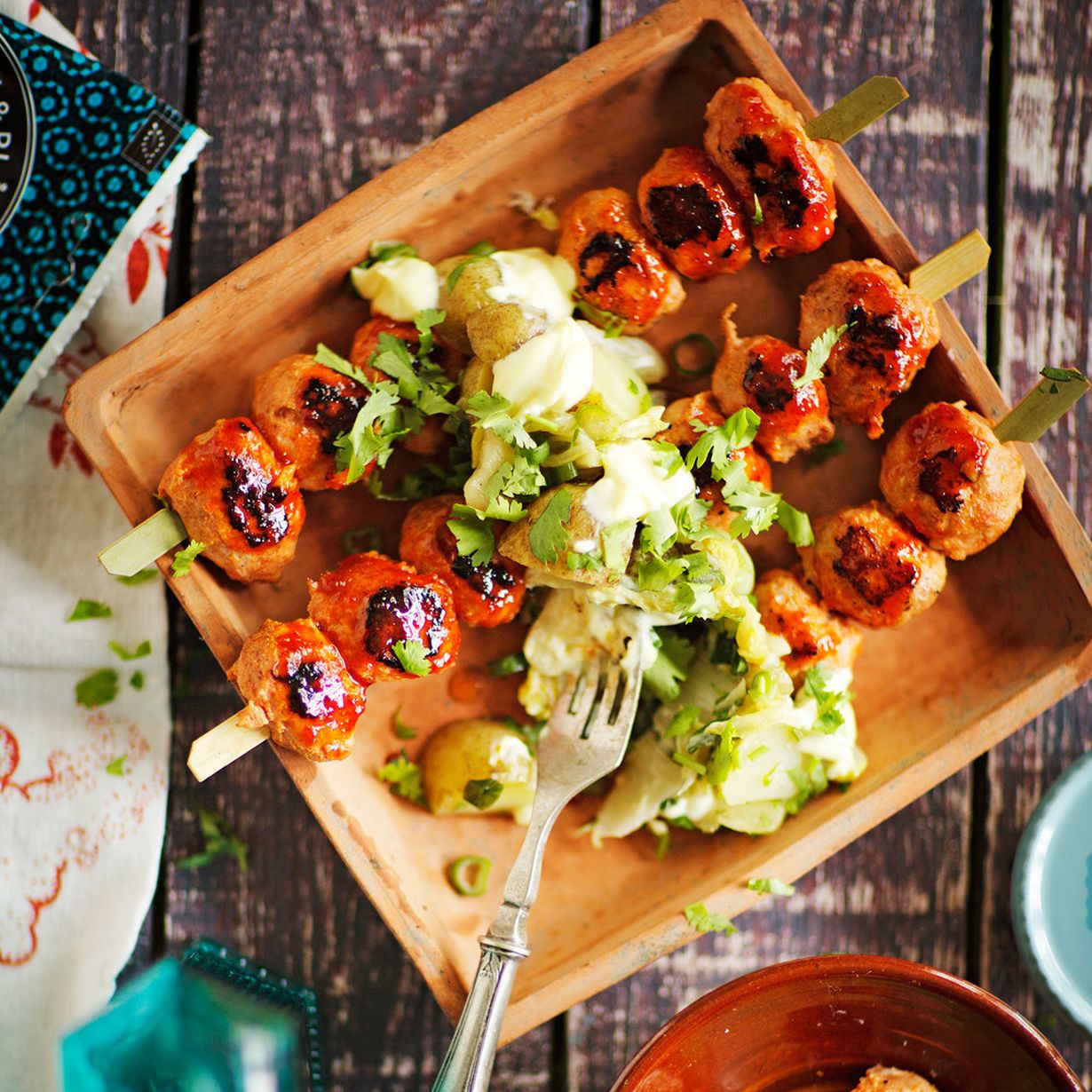 - Pujota kypsät pyörykät vartaisiin. Sekoita marinadi bulgogikastikkeesta, sokerista ja 1 rkl:sta gochujang-chilitahnaa. Sivele vartaat marinadilla ja grillaa niihin kaunis väri. Tarjoa heti kimchi-perunasalaatin ja sitruunaruohomajoneesin kanssa.