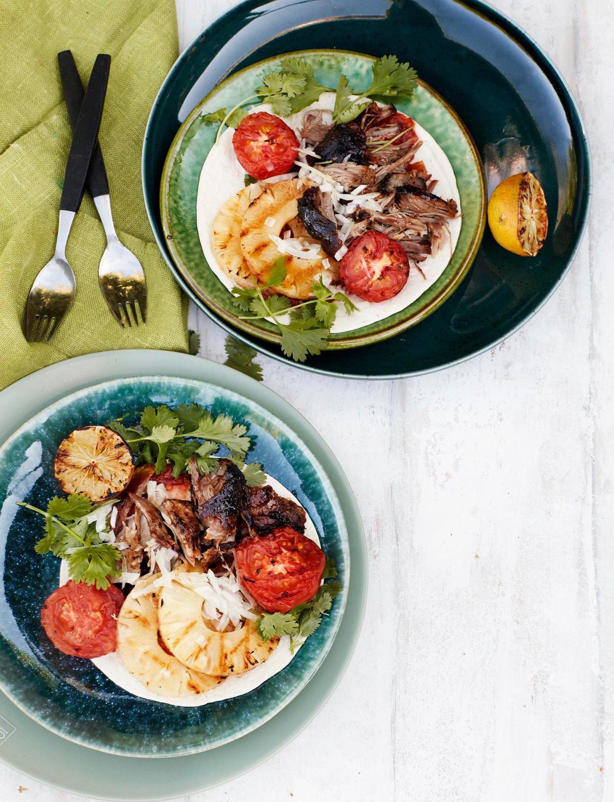Tarjoile liha pehmeiden tortillalettujen, grillatun ananaksen ja tomaatin, hienonnetun sipulin ja korianterin kanssa. Purista pinnalle mausteeksi sitruunamehua.