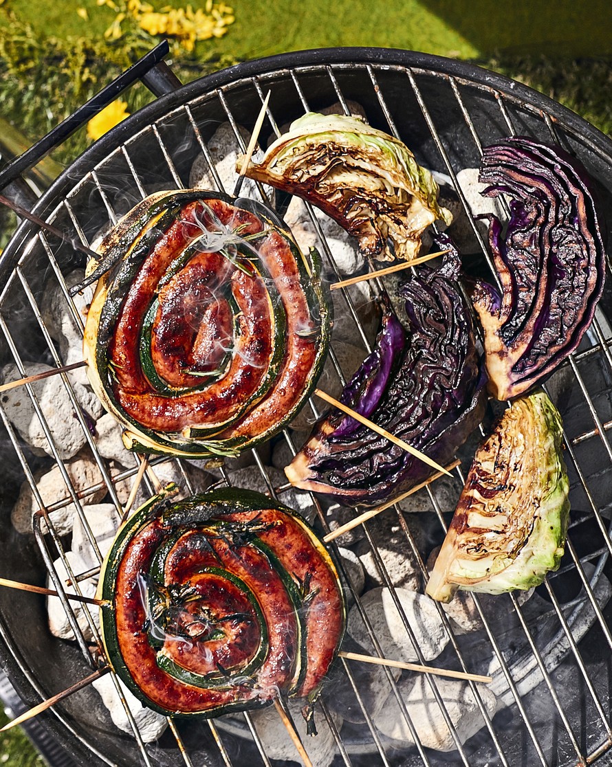 Tuoremakkarat kääriytyvät rullalle ja väliin sujautetaan kesäkurpitsaa. Lihan ystävä kääri ympärille vielä pekonia.