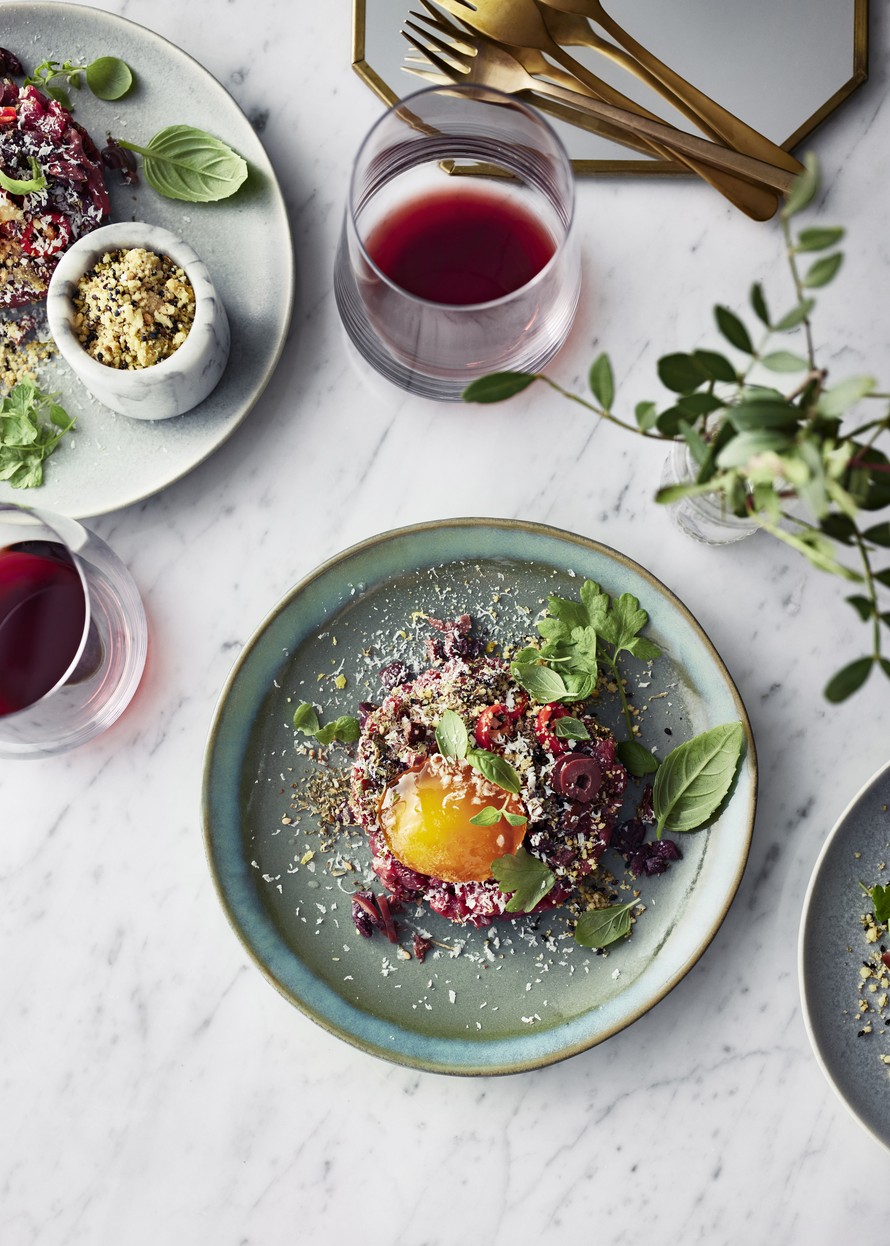 Steak tartare eli tartarpihvi päivittyy ajankohtaiseksi marokkolaisten mausteiden, kuten za'atarin ja sahramin, avulla. Viimeistele pakastetusta fetapalasta raastettavalla "lumella". Muista varata tarpeeksi aikaa keltuaisten graavaamiseen!