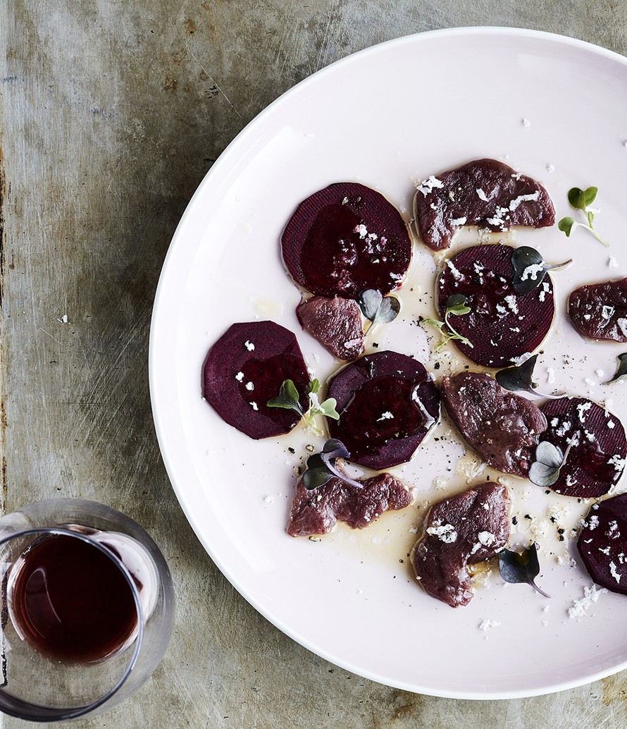 Elegantti pääsiäisen alkuruoka valmistetaan karitsan sisäfileestä sekä punajuuresta ja viimeistellään pakastetusta fetasta raastetulla "lumella".