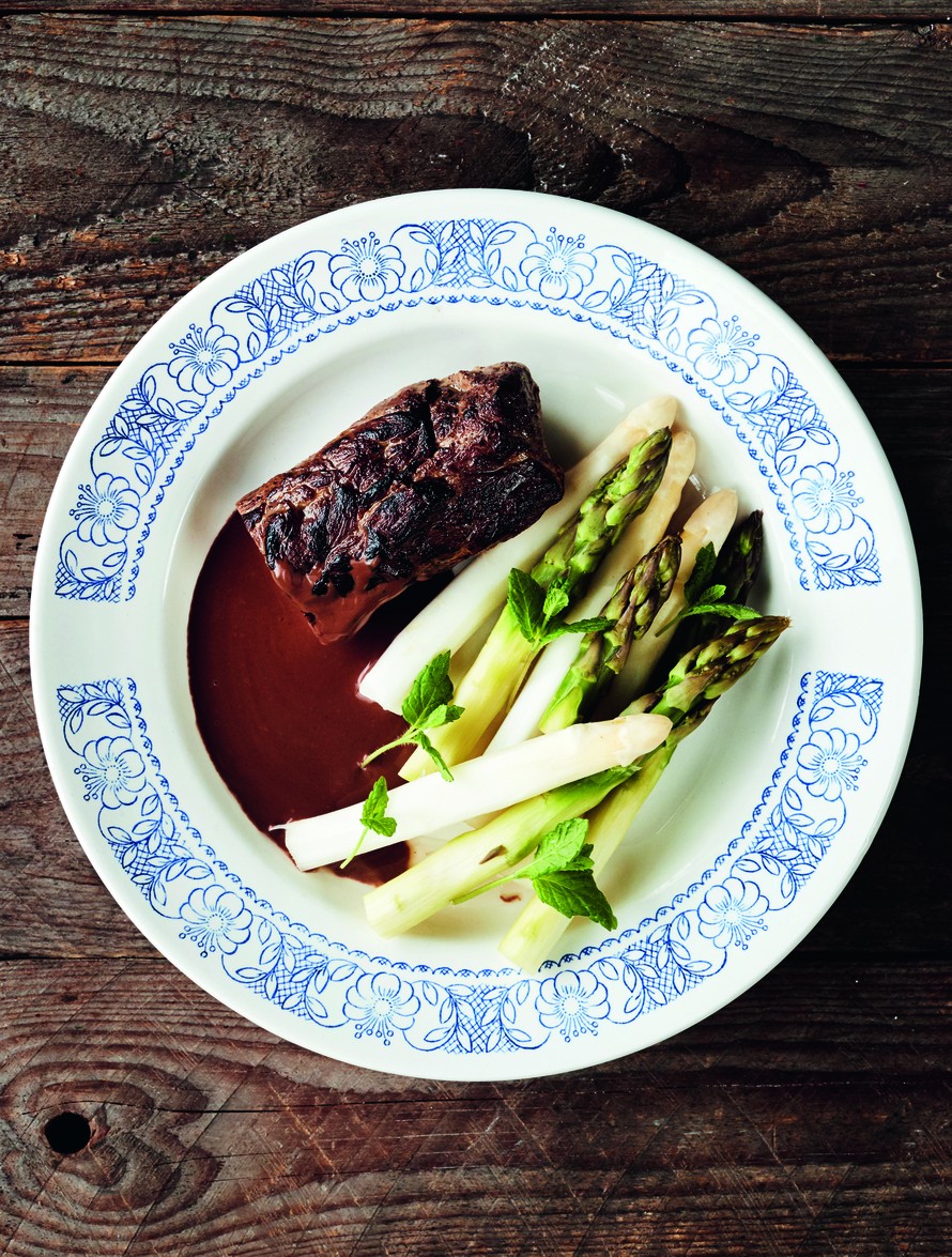 Ylikypsä karitsa, parsat ja suklaa-punaviinikastike