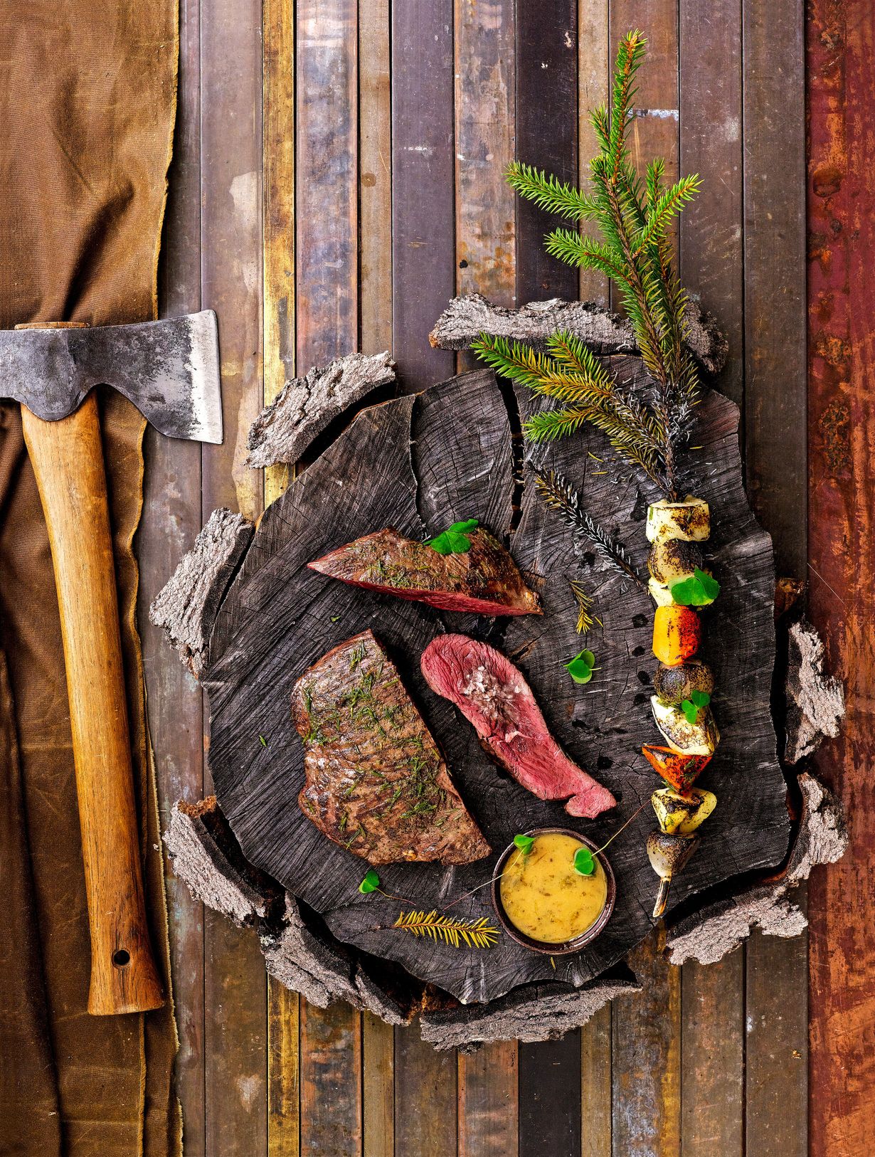 Porkkanoista, palsternakoista ja juuriselleristä saat napakat grillivartaat, kun esikeität juureksia ensin kolmisen minuuttia. Varrastikkuina toimivat havunoksat. Metsäsinappiin saat uutta makua ketunleivistä.