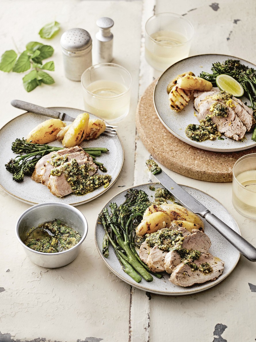 Valkoviinimarinoitu grillipossu ja pistaasikastike