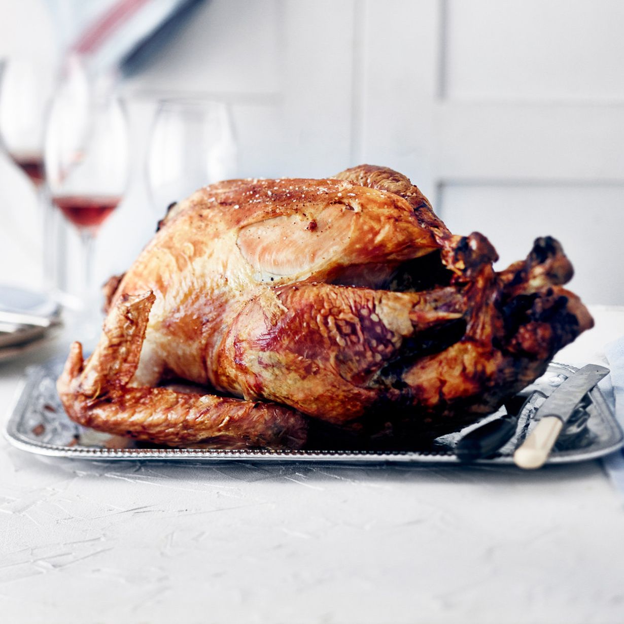 - Laita uuni kuumenemaan 160 asteeseen. Täytä lintu. Sido kalkkunan jalat ja siivet paistinarulla. Valele linnun pinta voi-öljyseoksella. Työnnä lihalämpömittari rintapalan paksuimpaan kohtaan. Laita kalkkuna rintapuoli ylöspäin uunipellille ja peitä löyhästi foliolla. Paista uunissa, kunnes mittari näyttää 75–85 astetta. Katso kypsennysajat alla olevasta taulukosta. Voit testata kypsyyden työntämällä grillitikun kalkkunan paksuimpaan kohtaan. Jos pistoskohdasta tuleva neste on kirkasta, liha on kypsää. Valele lintua 3–5 kertaa paistamisen aikana pannulle kertyvällä nesteellä. Poista folio, kun lintu on ollut uunissa noin 3 tuntia.