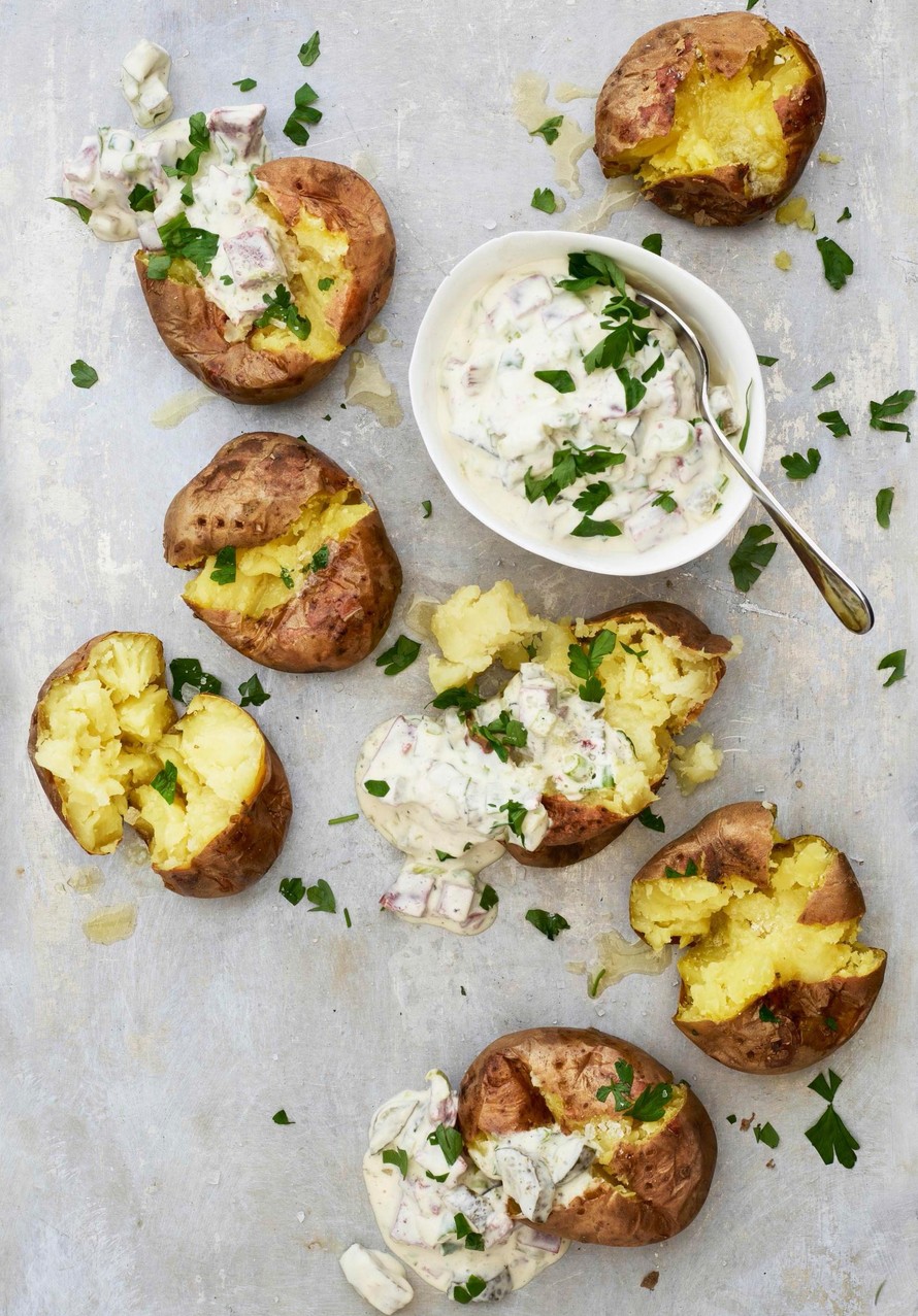 - Anna perunoiden vetäytyä 10 minuuttia huoneenlämmössä. Halkaise ja täytä perunat.
