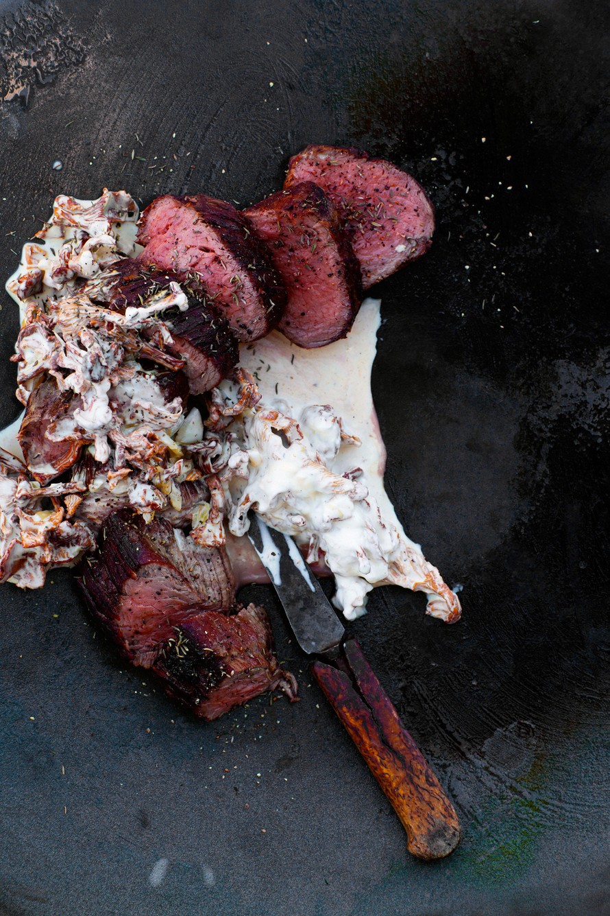 Mehevä sisäfilee ja kermainen kantarellimuhennos. Siinä on pihviruoka parhaimmillaan!