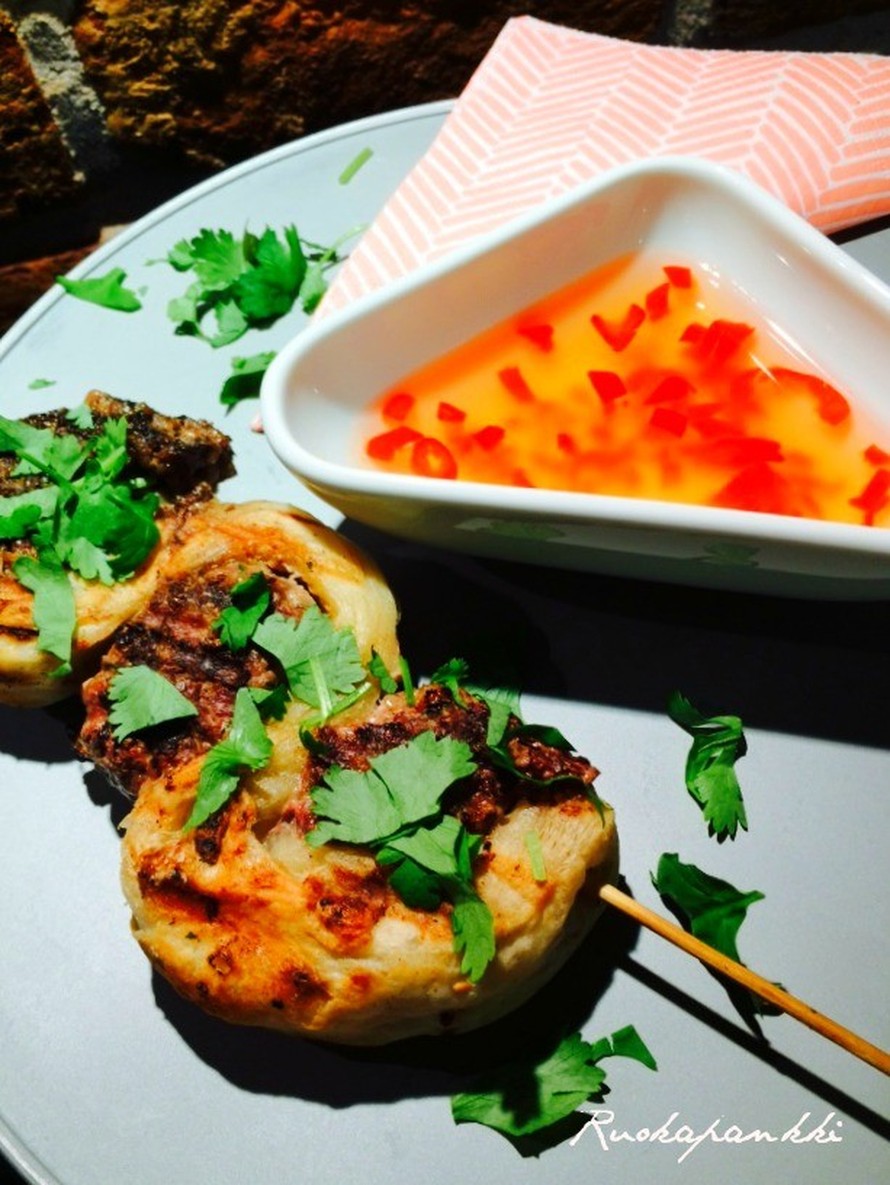 Sulata lehtitaikina paketin ohjeen mukaan. Laita puutikut veteen vettymään. Hienonna sipuli, valkosipuli ja korianteri aivan hienoksi esim. tehosekottimella vai silppuri mikä lie onkaan oikealtaan nimeltään. Sitten kaada seos jauhelihan, munan, korppujauhojen ja mausteiden sekaan. Sekoita kaikki tasaiseksi massaksi. Anna hetken maustua. Levitä iso taikinalevy alustalle ja leikkaa siitä 2 cm x 25 cm pätkiä. Pujota ensiksi taikinan toinen pää tikkuun, sitten pyöräytä lihapulla ja sen työnnät perään ja näin jatkat ja lopetat taikinaan. Sitten vaan teet tollain kaikki. Uunissa laittaessa: Voitele kananmunalla ja pistä uuniin 200 asteeseen noin 20 minuuttia tai kunnes taikina on kypsää ja saanut väriä, sekä pulla on kypsä tai medium. Grillatessa: Grillin tulee olla kuuma ja sitten vaan voite öljyllä lihapullatikkujen pinnat ja paistat ala tasolla hetken puolin ja puolin, kypsennä ylätasolla kypsäksi. Kokonaisuutena menee noin 15-20 minuuttia. Ripottele päälle hieman tuoretta korianteria ja herkuttele sweet chili kastikkeen kanssa.