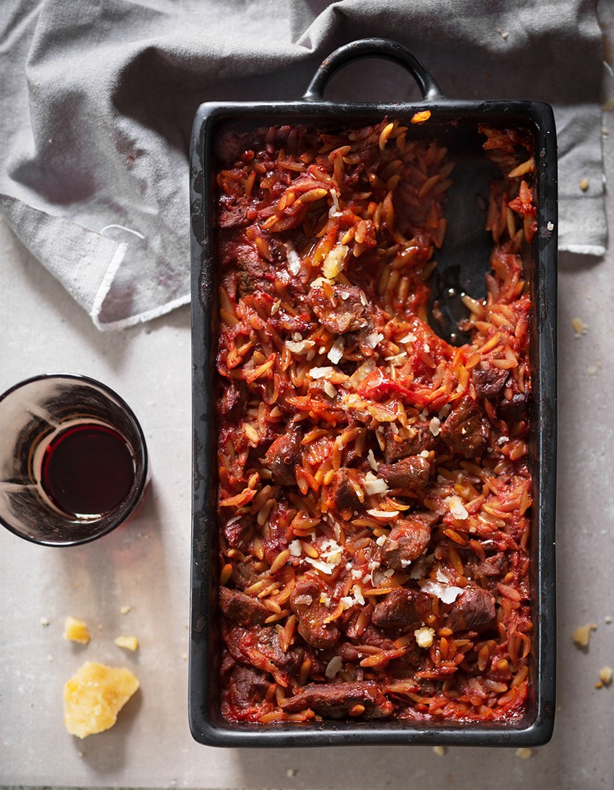 Orzo-jyväpasta eli kreikkalaisittain kritharáki on kiitollinen aines tässä lohturuuassa, jossa yhdistyvät pastan ja risoton parhaat ominaisuudet. Padassa haudutettu lammas pääsee vielä lopuksi orzon kanssa uuniin.