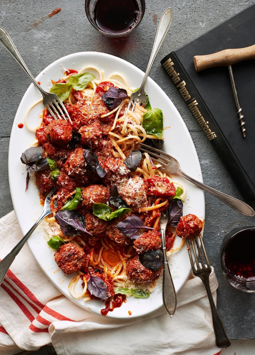 Mainiot lihapullat saavat makunsa italialaistyylisistä raakamakkaroista. Riittoisan lihapullapastan esikuvana on Kummisetä-elokuva.