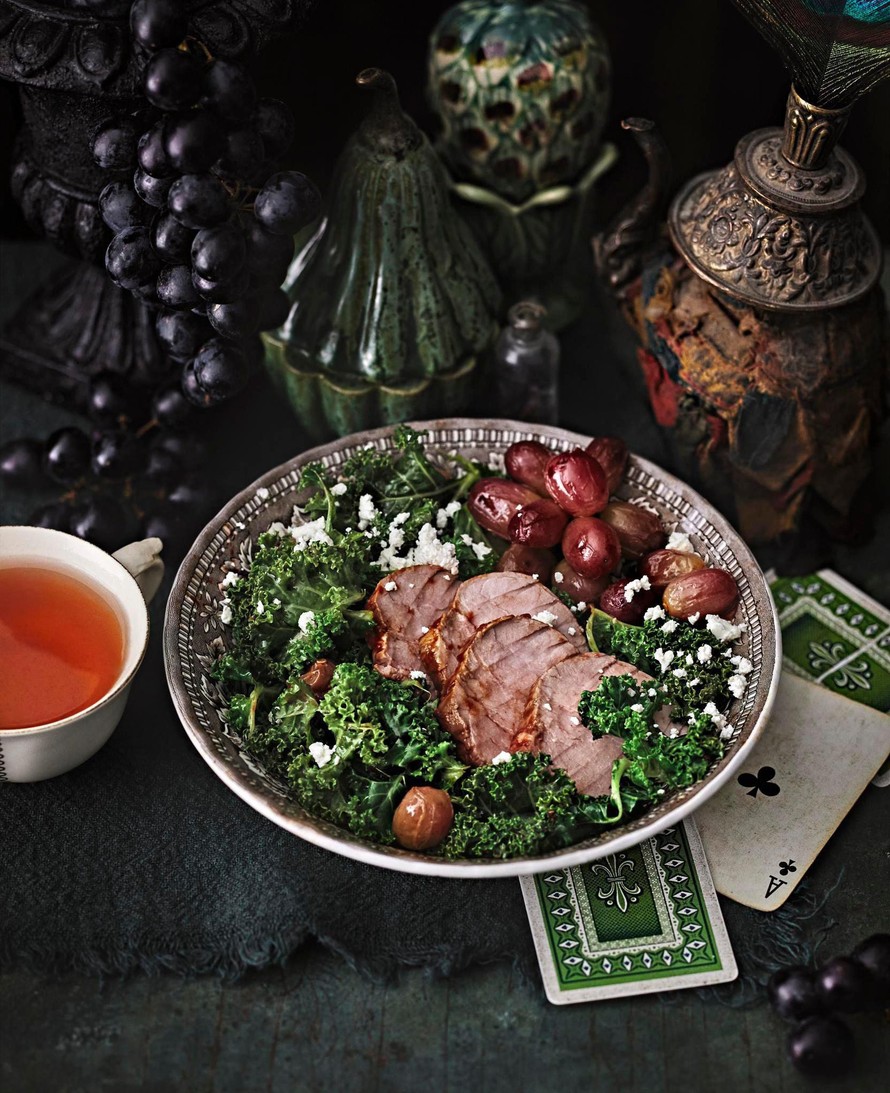 BBQ-maustettua porsaanfileetä, paahdettuja viinirypäleitä ja lehtikaalia suoraan pannulta. Tämä kylmän kauden salaatti on lämmin ja täynnä makua.