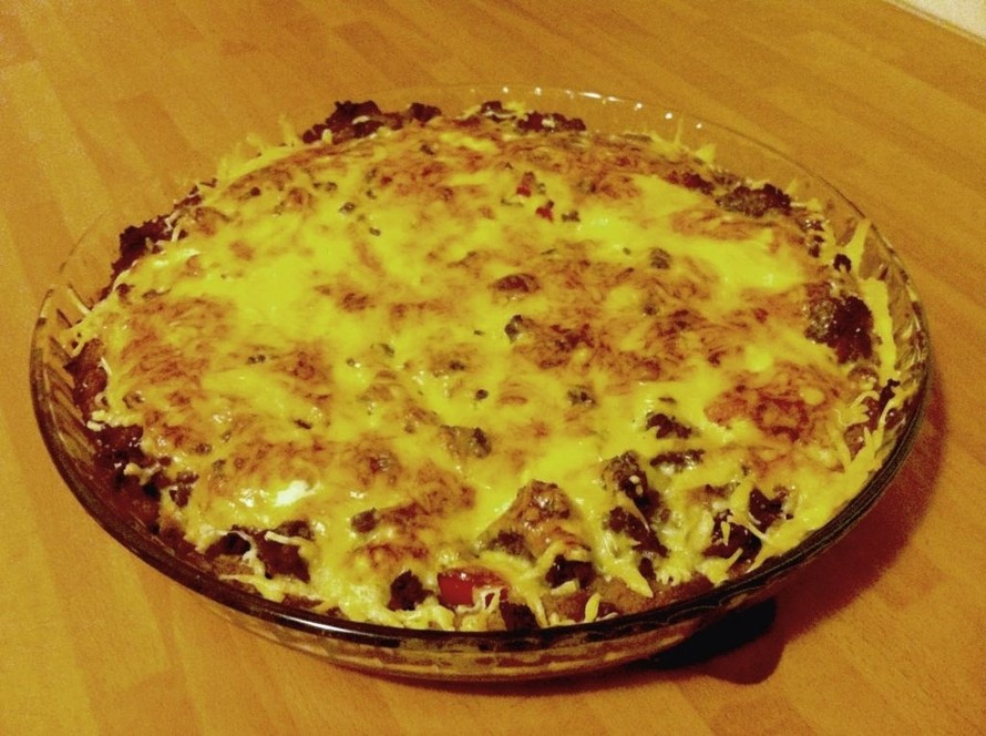 Ota taikina uunista 10 min. jälkeen ja levitä jauheliha/paprika sekoitus sen päälle.
