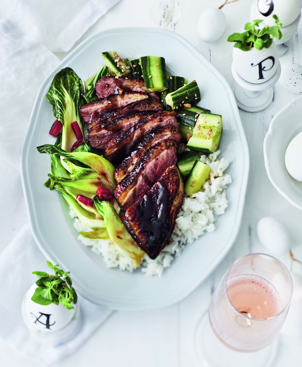 8. Viipaloi ankanrinnat. Valuta loppu kastike päälle. Tarjoa seesamikurkkujen, paksoin ja riisin kanssa.