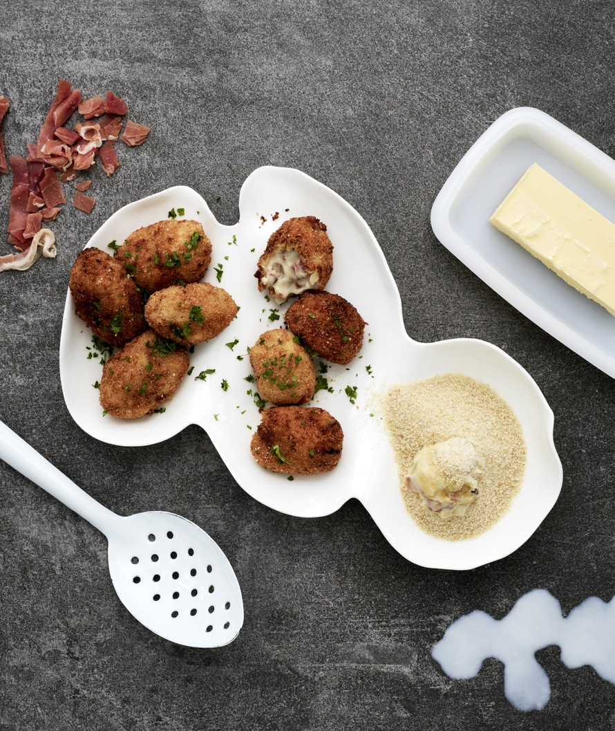 Espanjalaiset kroketit valmistetaan paksusta béchamelista. Kinkun lisäksi myös esimerkiksi sienet, poronliha ja savukalat sopivat valkokastikkeen pariksi.