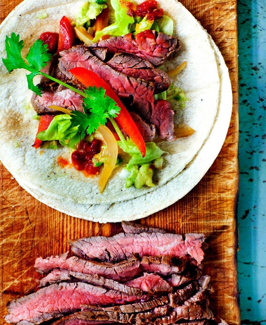 - Leikkaa liha hieman vinottain syitä vasten ohuiksi viipaleiksi. Ripottele juustoraastetta lämpimilleviipaleille. Tarjoa heti lämpimien tortillojen ja muiden lisukkeiden kanssa.