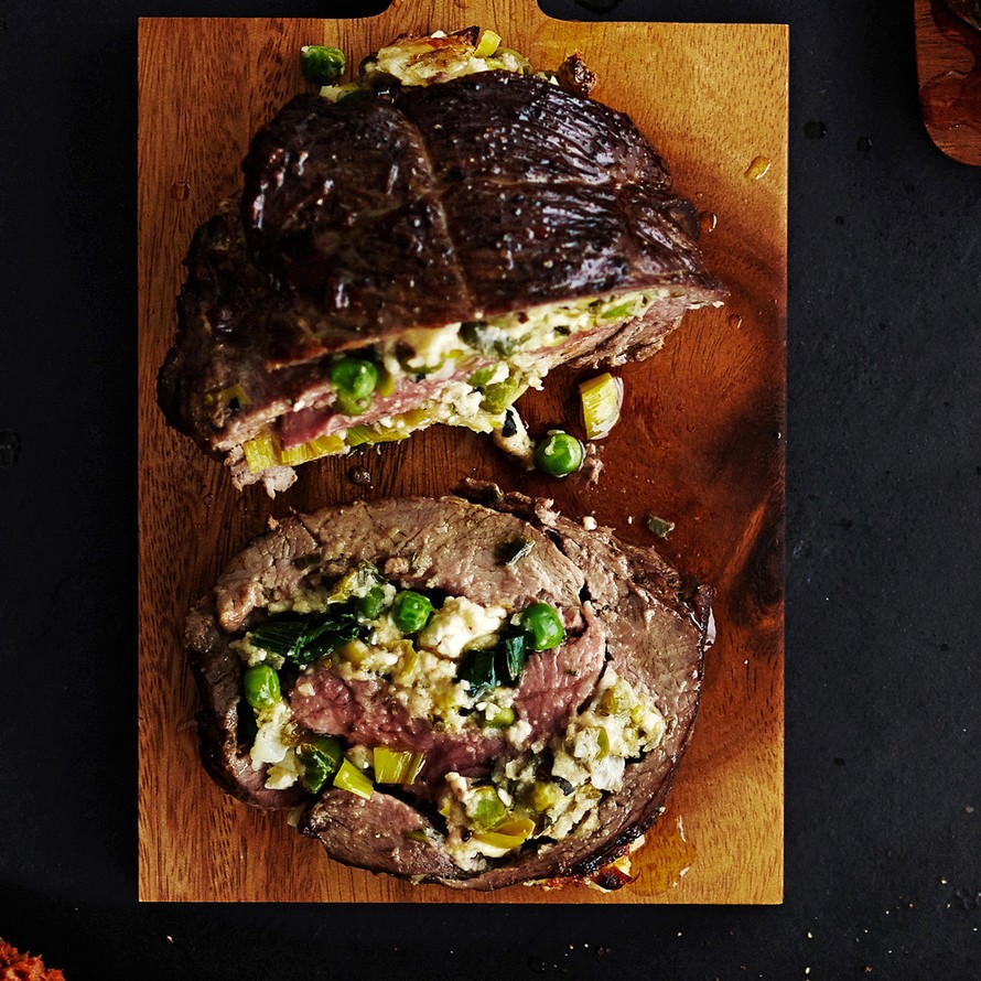 - Nosta paisti leikkuulaudalle. Leikkaa pinnasta liika rasva pois. Levitä paisti laudalle levyksi. Tee lihan paksuimpiin kohtiin kevyitä (1–2 cm) viiltoja 4–5 cm välein. Tee viillot lihassyiden suuntaisesti. Nuiji paistia esim. kaulimella, jotta levystä tulee tasaisen paksu (korkeintaan 5 cm). Mausta suolalla ja pippurilla. Levitä täyte tasaisesti, jätä kaksi senttiä reunoista vapaaksi. Kääri liha rullalle ja sido tiiviisti narulla.