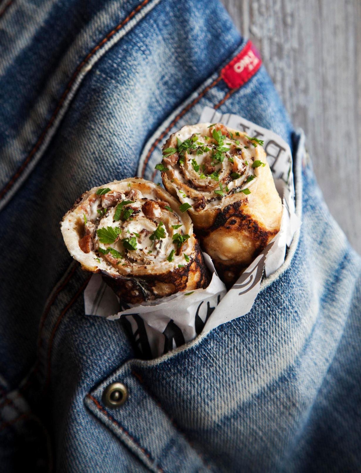 Wrapien eli lettukääröjen helppo suolainen täyte sekoitetaan tuorejuustosta ja mausteisesta makkarasta. Kuohkeaan taikinaan sekoitetaan olutta ja chiliä.