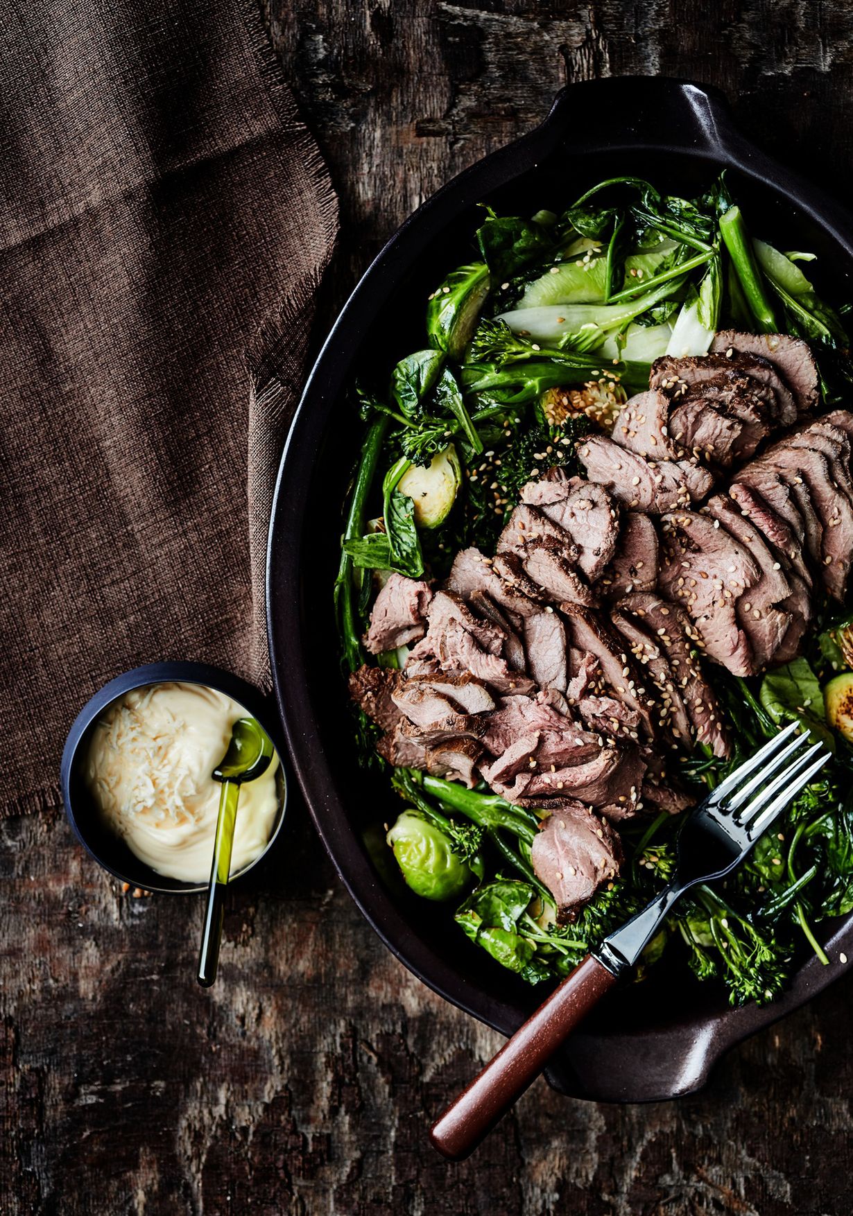 Tee lihalle kastike sekoittamalla raastettu piparjuuri ja majoneesi keskenään. Tarjoa pikapaistettujen pikkukaalien kanssa (ohje alla).