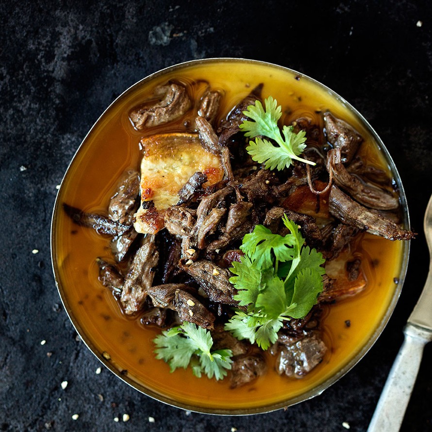- Laita sorsa ja pekoni tarjolle kulhoihin ja valuta kuumaa paistolientä päälle kostukkeeksi. Koristele korianterilla ja pippurilla.
