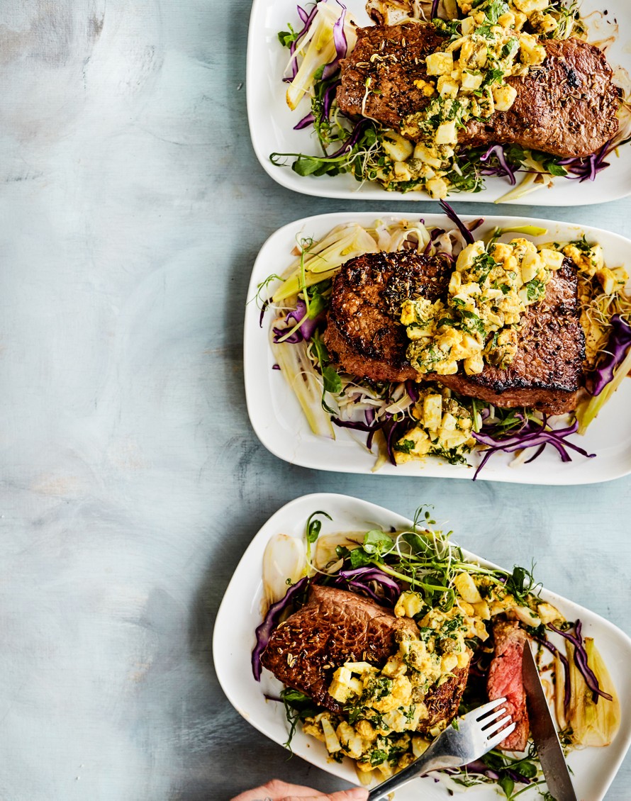 - Ota pihvit huoneenlämpöön 20 minuuttia ennen paistamista. Mausta lihat heti: Rouhi pippurit ja fenkolinsiemenet huhmaressa ja pyöritä lihat mausteissa kauttaaltaan. Mausta suolalla molemmin puolin.