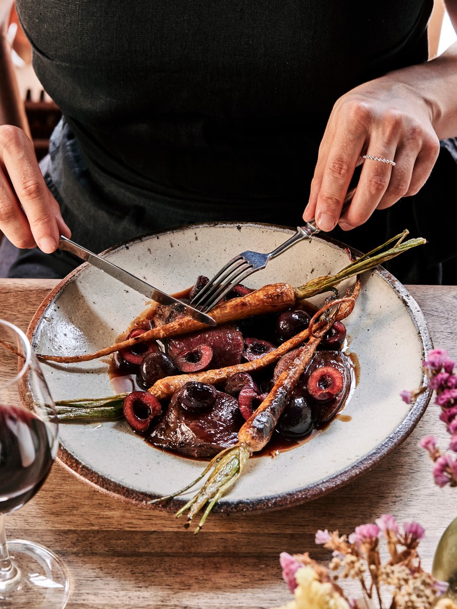 Pienet palsternakat imaisevat pannulta peuranfileen maut. Syvänmakuinen kirsikkakastike on tälle kaksikolle herkullista seuraa.