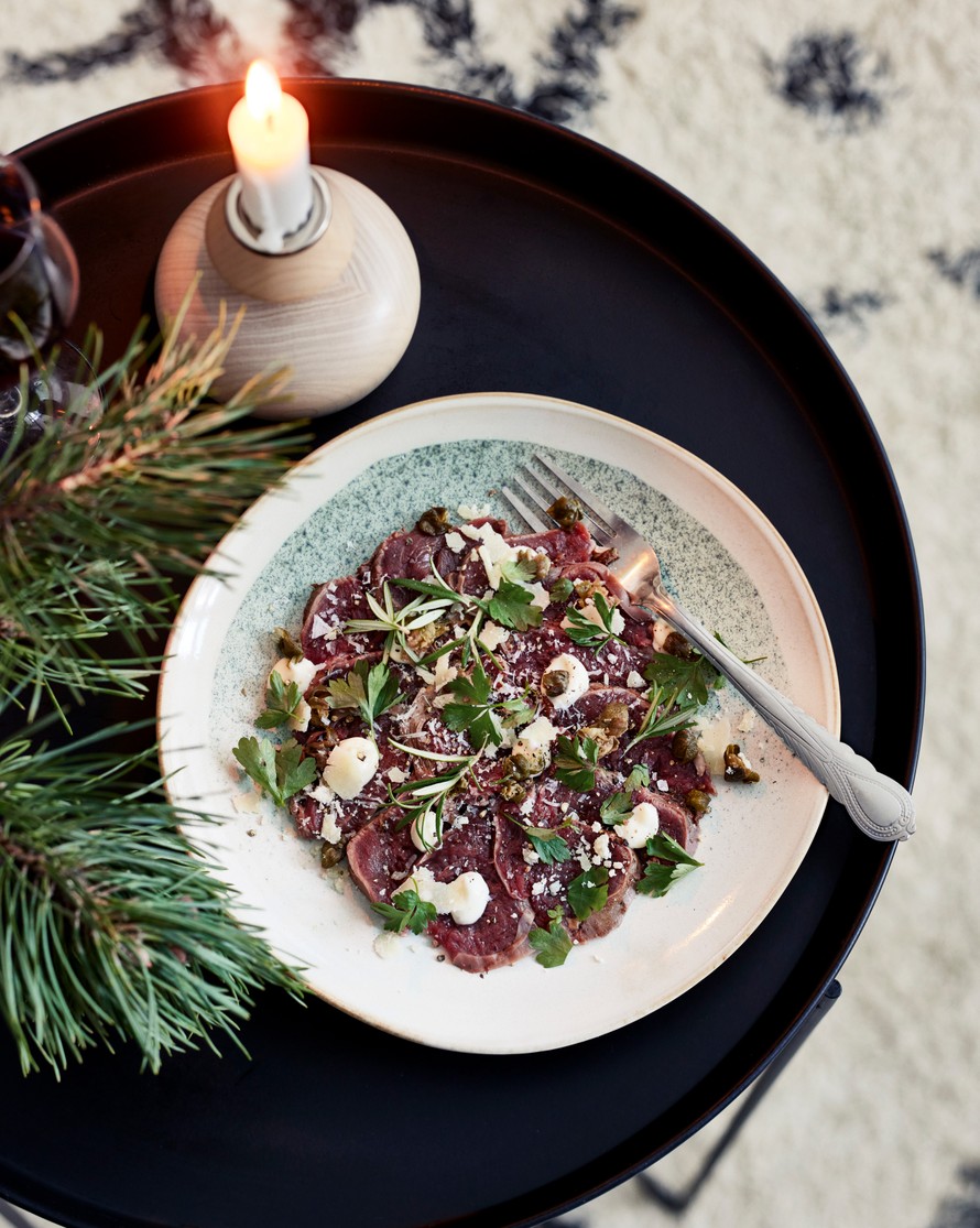 Pintapaahdettu porocarpaccio on talvinen alkuruoka parhaimmillaan. Sardelliaioli antaa porolle umamisen lisämaun, ja rapeiksi paistetut kaprikset ovat piste iin päälle.