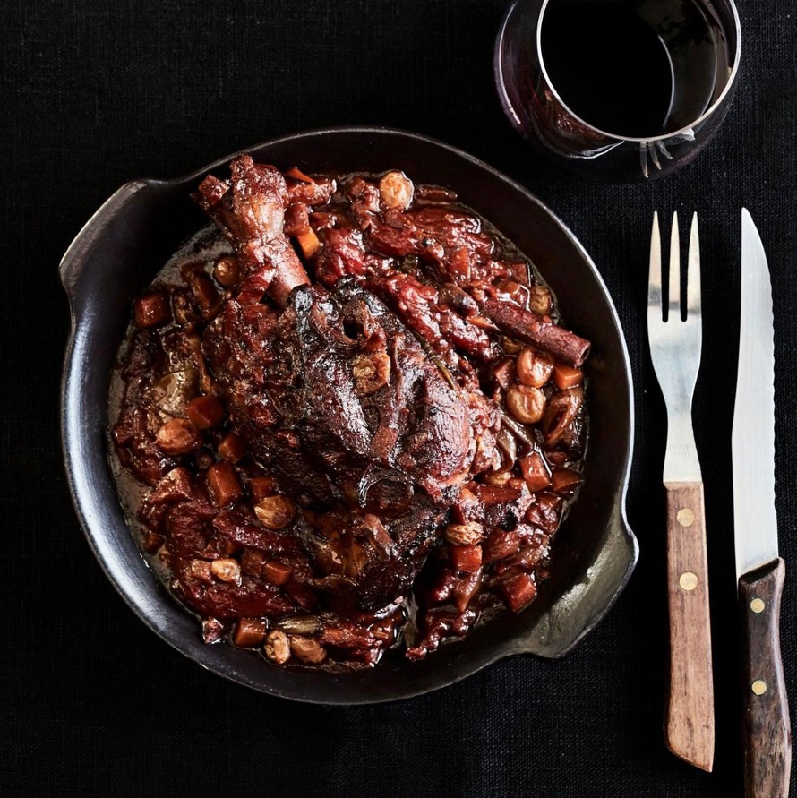 Kuori ja leikkaa salottisipulit puoliksi. Kuori ja kuutioi porkkanat. Hienonna valkosipulinkynsi. Sido timjamista, rosmariinista ja laakerinlehdistä maustekimppu.