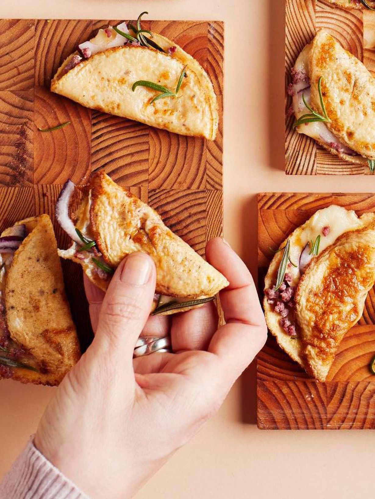 Laita täytteitä toiselle puoliskolle ja käännä veitsen avulla toinen puoli päälle puolikuuksi. Anna vielä tekeytyä noin minuutti, voit painaa ”kantta” hieman tiiviimmäksi. Nosta tarjolle.