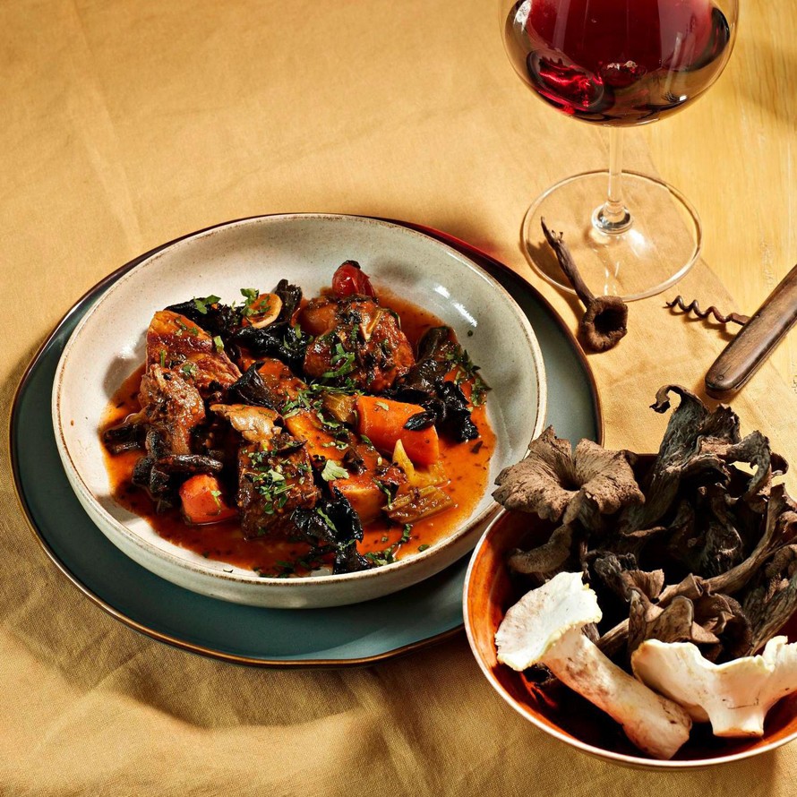 Laita lihat, sienet, juurekset ja sellerit pataan. Kaada viini päälle ja kuumenna kiehuvaksi. Lisää vesi ja tomaatit pataan. Mausta basilikalla ja suolalla. Kuumenna pata kiehuvaksi, alenna lämpöä ja hauduta kypsäksi kannen alla vähintään tunti tai kunnes liha on mureaa.