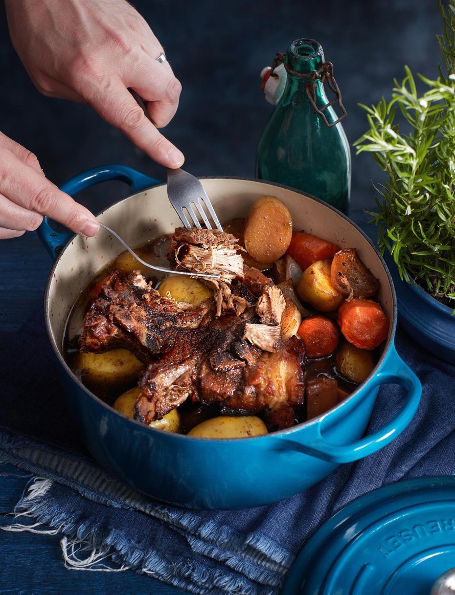 Laita pata uuniin 15 minuutiksi. Käännä liha ja kypsennä toiset 15 minuuttia. Laske uunin lämpö 150 asteeseen, peitä pata kannella tai foliolla ja hauduta tunti.