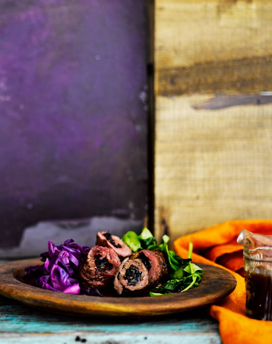 Torvisienillä täytetyt vasikanlihakääryleet, punakaali ja timjami-tyrnikastike