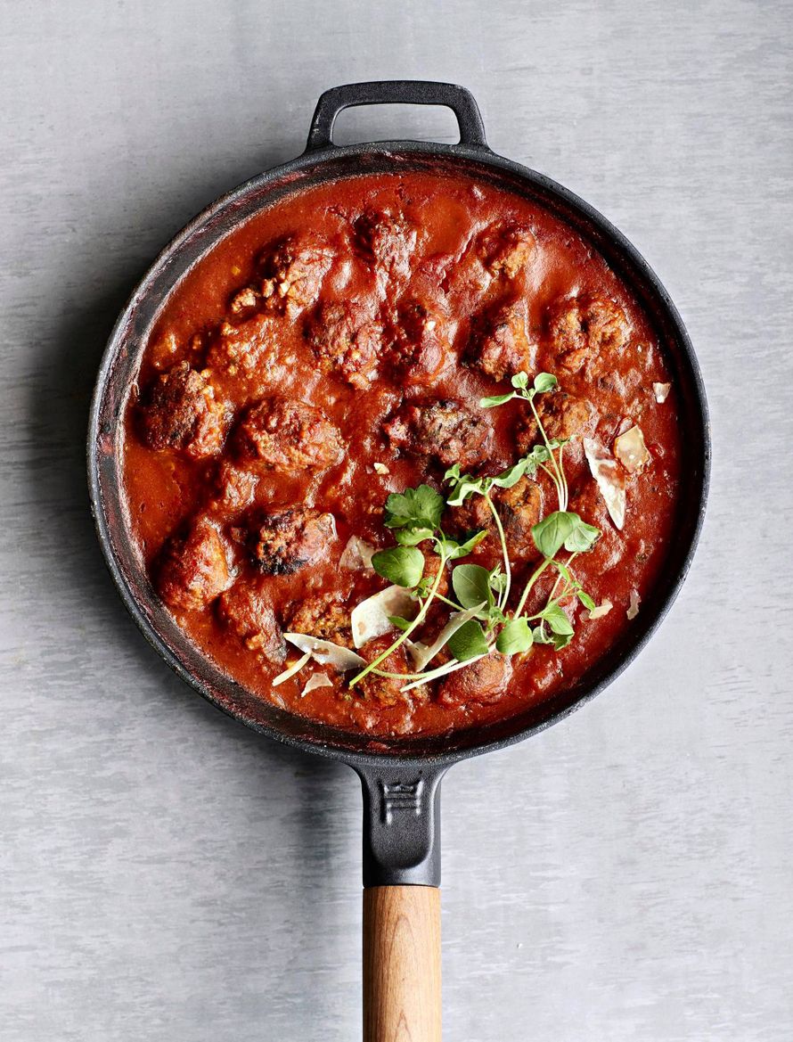 Valkosipulilla maustetut lihapullat kypsyvät herkullisiksi yrteillä maustetussa tomaattikastikkeessa.