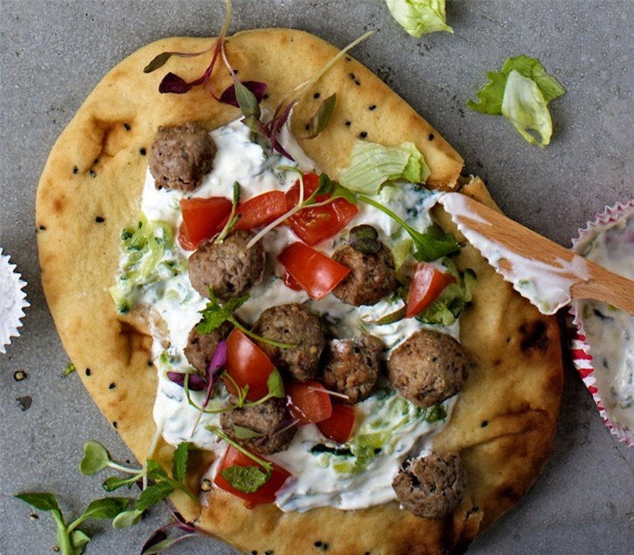 Karitsanjauhelihapyörykät maustetaan vahvasti ja kääritään naanleivän sisään.