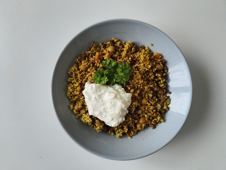 4. Lisää sen jälkeen valutetut ja huuhdotut kikherneet ja bulgur. Sekoita hyvin.