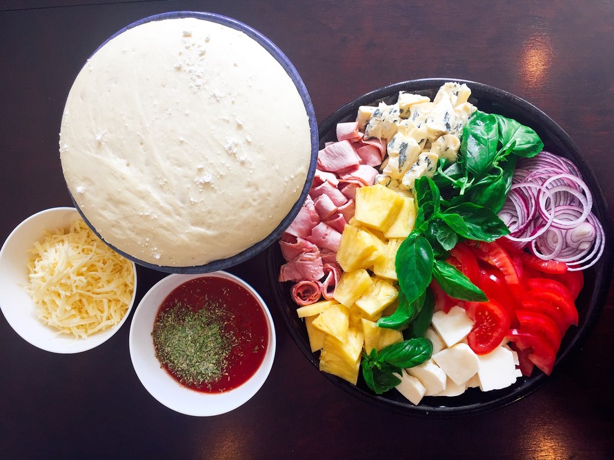 1. Valmista pizzapohja. Lämmitä vesi hieman kädenlämpöä lämpimämmäksi (42 °C astetta). Sekoita keskenään kuivahiiva, suolaa, sokeri ja osa vehnäjauhoista. Lisää veden joukkoon. Vaivaa taikinaa ja lisää loput vehnäjauhot. Lisää lopuksi öljy. Vaivaa, kunnes taikina irtoaa astian reunoista. Anna kohota lämpimässä paikassa täytteiden valmistelun ajan.