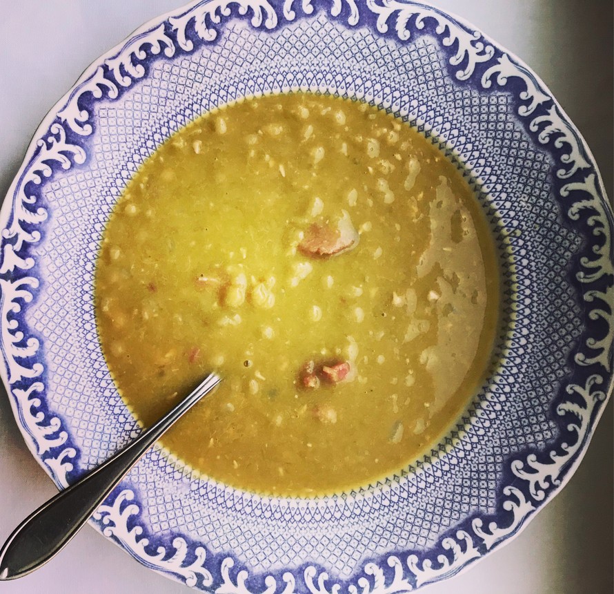 - Kun olet keittänyt herneitä noin tunnin, lisää sianpotka ja silputtu sipuli. Keitä vielä pari tuntia, kunnes herneet ovat pehmenneet ja keitto on paksua ja sakeaa. Mausta suolalla (ja meiramilla) vasta keittämisen loppuvaiheessa. Ota sianpotka pois kattilasta, anna jäähtyä hetki. Irrota lihat ja paloittele ne keittoon.