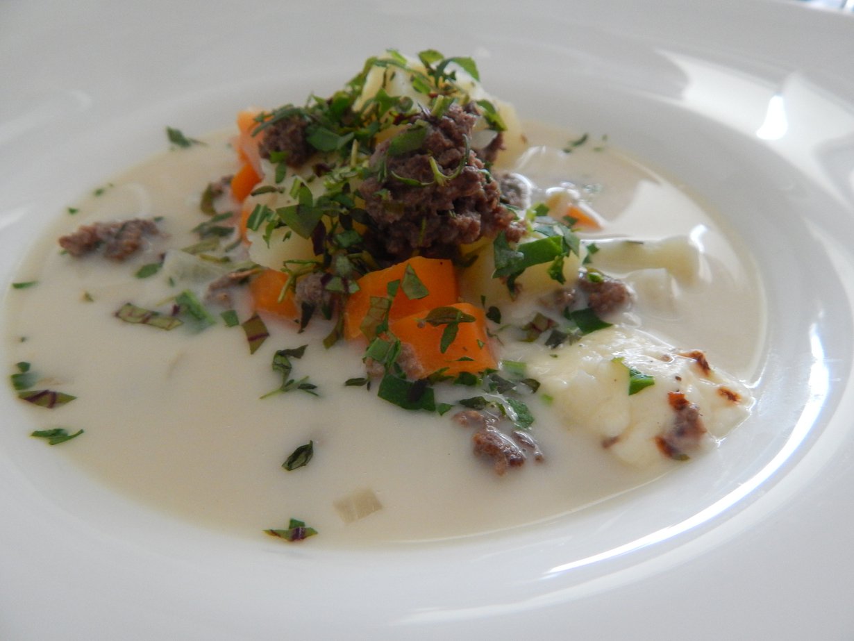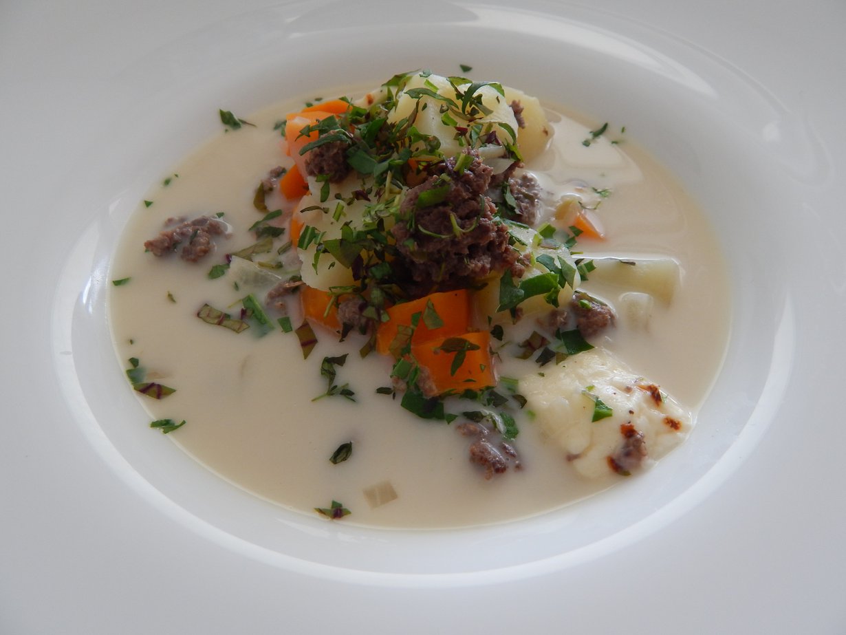 Paista jauheliha ja mausta. Kuori ja pilko porkkanat, perunat ja sipuli. Laita kattilaan kiehumaan. Lisää mausteet, jauheliha ja sulatejuusto. Hienonna yrtit ja kuutio leipäjuusto. Kun kasvikset on kypsät lisää yrtit ja leipäjuusto. Älä keitä enään ettei leipäjuusto sula sekaan.