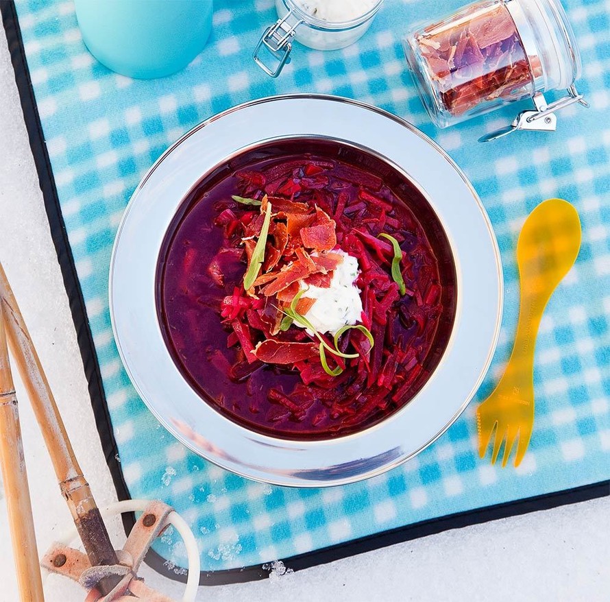Kasvissyöjä nauttii borssikeiton smetananokareen kanssa, lihansyöjä ripottelee päälle myös parmankinkkua.