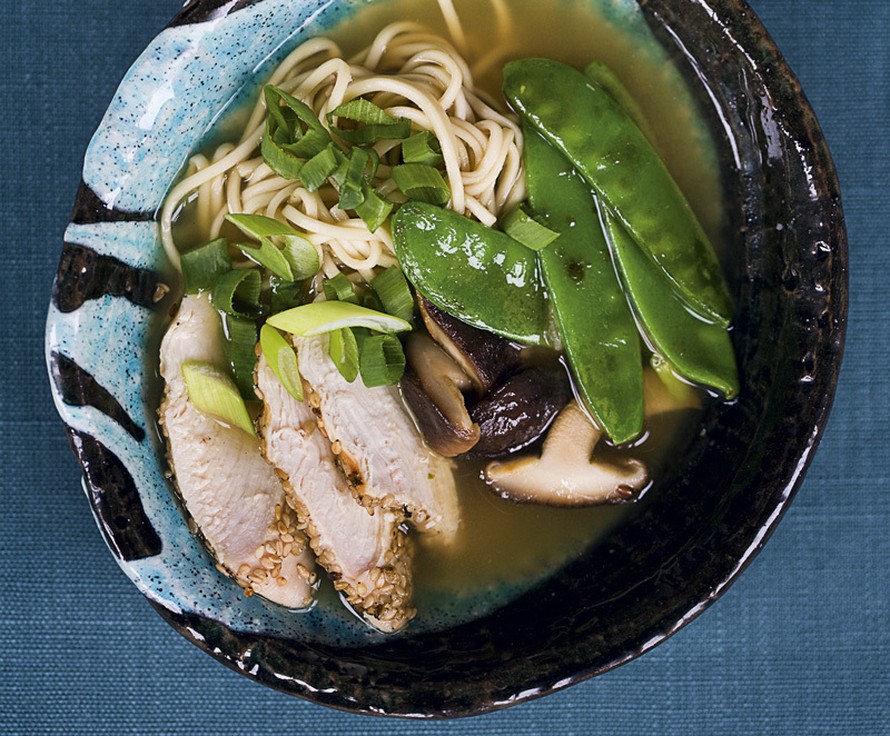 - Jaa nuudelit, broileripalat, sieni-herneseos ja kevätsipulit tarjoilukulhoihin. Kauho liemi päälle ja tarjoile.