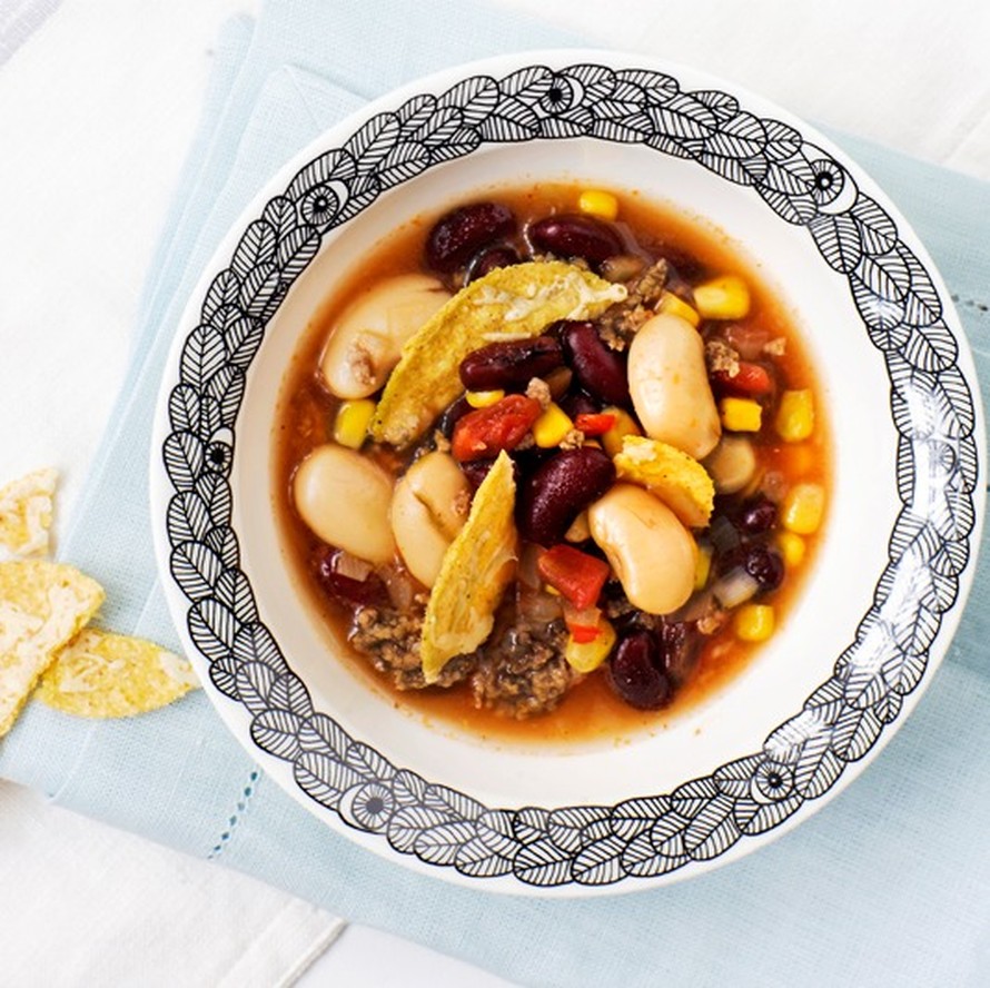 - Lisää pannulle jauheliha ja paista se kypsäksi. Kumoa seos isohkoon kattilaan ja lisää vesi, hienonnetut liemikuutiot, maissi ja maustunut papuseos. Keitä hiljalleen noin 15 minuuttia.