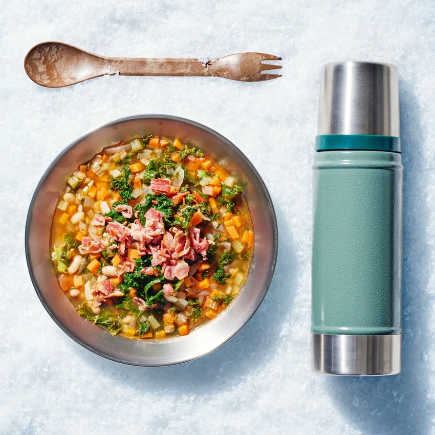 Runsaasti kasviksia sisältävä tuhti keitto saa savun makua pekonista ja ruokaisuutta pavuista.
