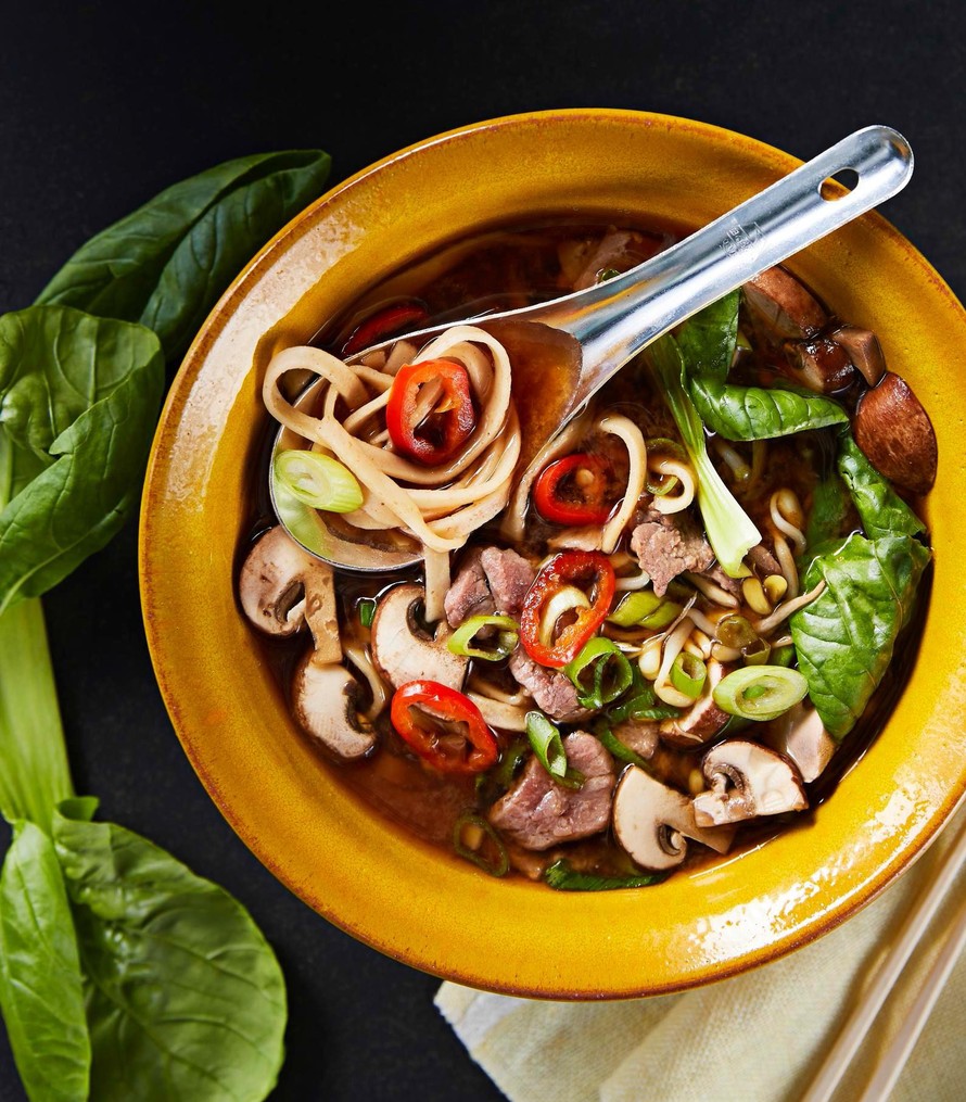 Vinkki! Naudanliha kypsyy kiehuvassa liemessä vain, jos palat ovat aivan ohuita suikaleita. Kasvisramen syntyy helposti, jos kuutioit lihan tilalle savutofua.