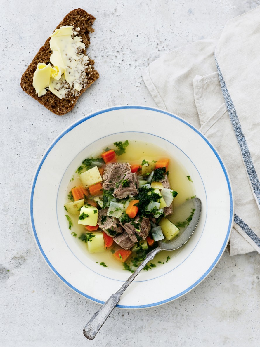 - Kuutioi liha ja lisää keittoon. Maista ja lisää tarvittaessa suolaa. Hienonna persiljanlehdet ja lisää ne keittoon. Nauti ruisleivän ja voin kera.