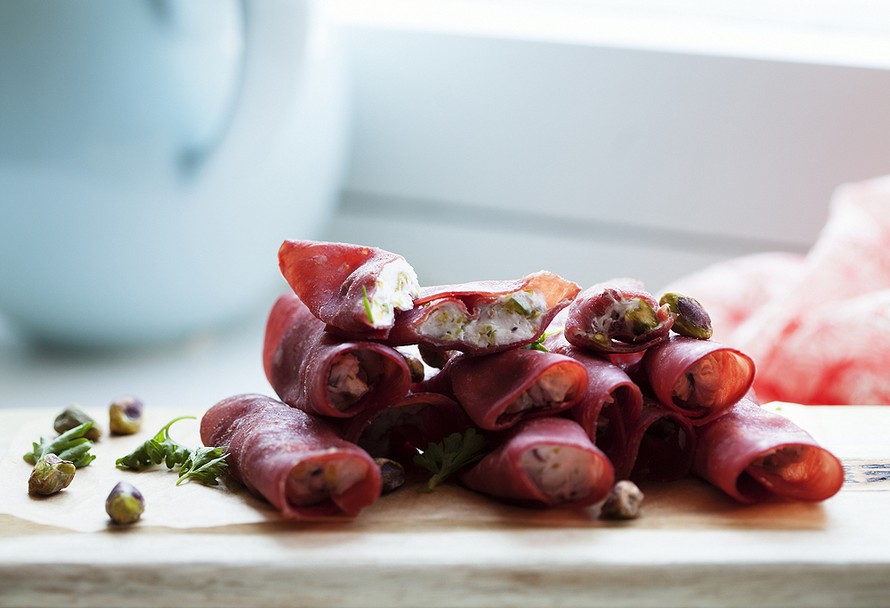 - Rullaa täyte härkäleikkeleiden sisälle. Laita valmiit rullat tarjoiluastialle ja ripottele päälle runsaasti persiljan kukintoja.
